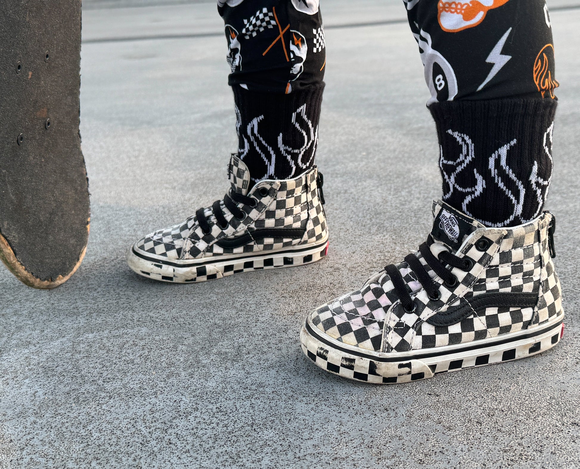 Add some heat to your step with our Black Flame Socks! These black socks feature white flames, perfect for the little spicy one in your life. Keep them stylish and sizzling with every step!