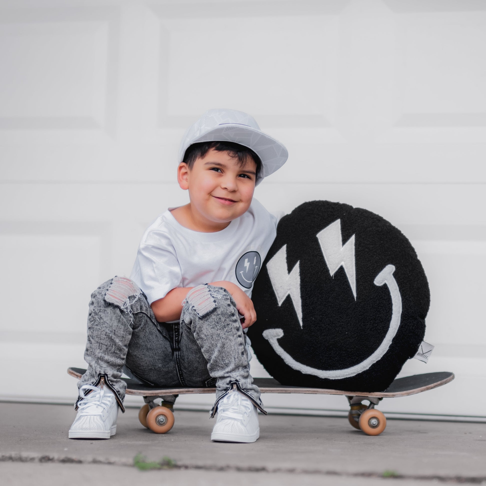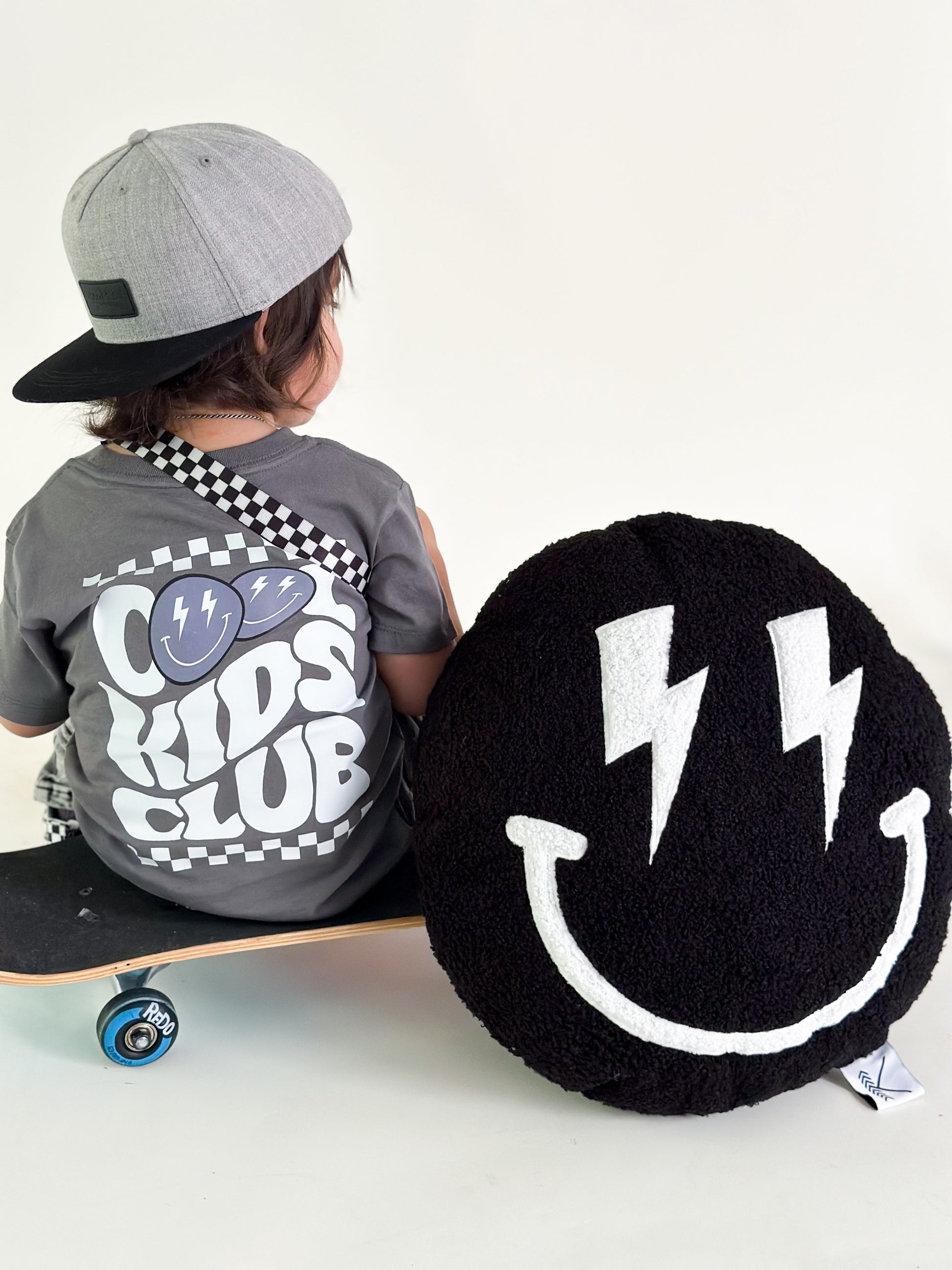 Calling all the cool kids to our cool smiley plush pillow! The perfect cuddle pillow for car rides or daycare. Stay hip, stay rad + stay cool even when sleeping.